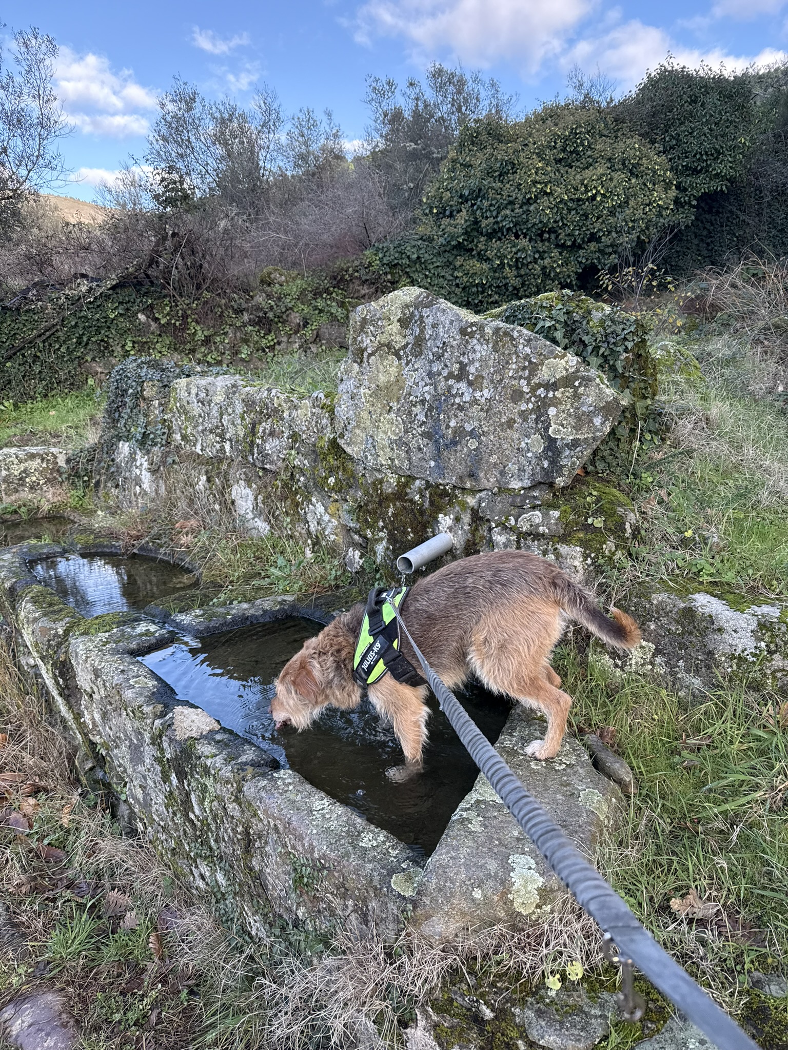 Desde aquí y hasta el municipio de Gata se comparte itinerario con el sendero PR-CC-189. Ruta de las Fuentes, que viene en sentido contrario al nuestro y cruza la carretera, en el puerto de la Cruz de Piedra, para seguir por la nueva pista forestal hacia Puerto Castilla. Este itinerario compartido desciende paralelo a la carretera por una pista hormigonada, al principio, y luego por un antiguo camino de piedra. Dejamos una fuente de fresca agua a la derecha, continuamos descendiendo y el sendero cruza un puente sobre la Rivera de Gata y entra, junto a la Ermita del Humilladero, en la población de Gata.