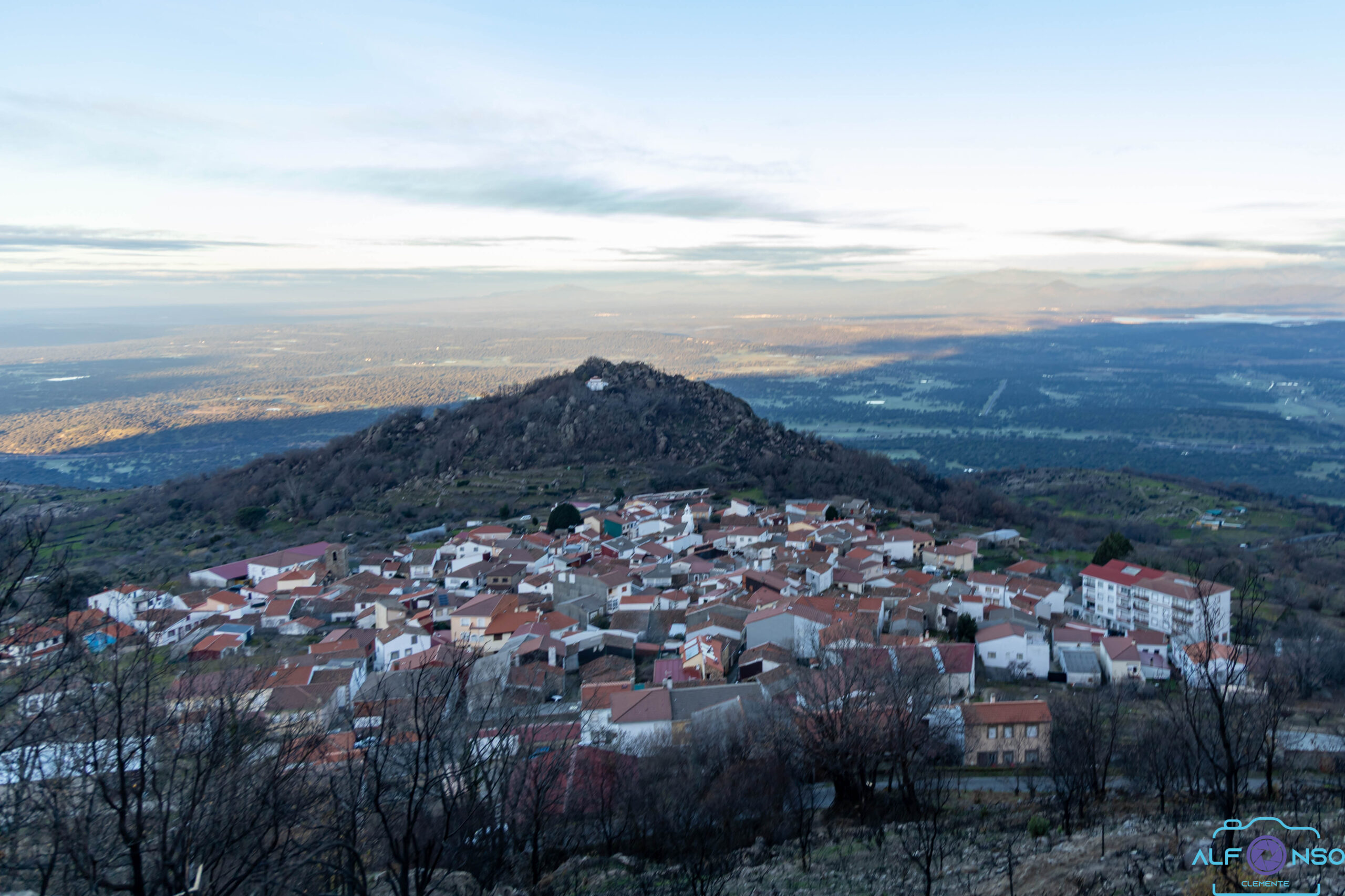 En la cima nos encontramos el pequeño promontorio que marca la cumbre junto con el vértice geodésico. Y dejamos atrás las tierras llanas de Granadilla para disfrutar del Valle del Jerte, los pueblos de derecha a izquierda: Casas de Castañar, Cabrero, Piornal y Valdastillas.