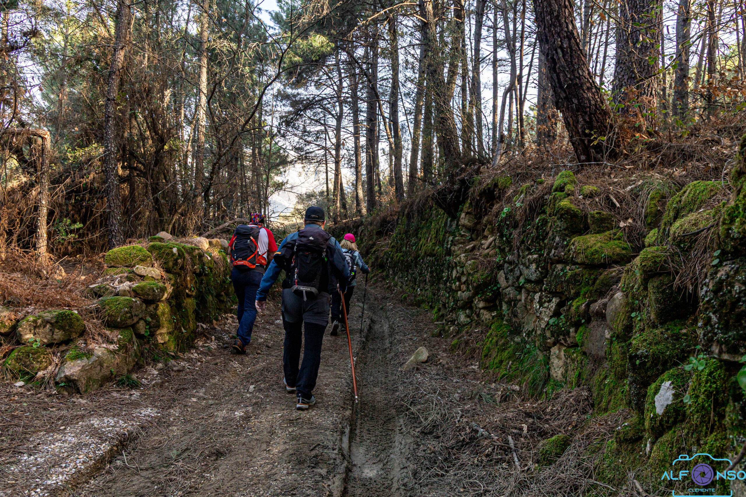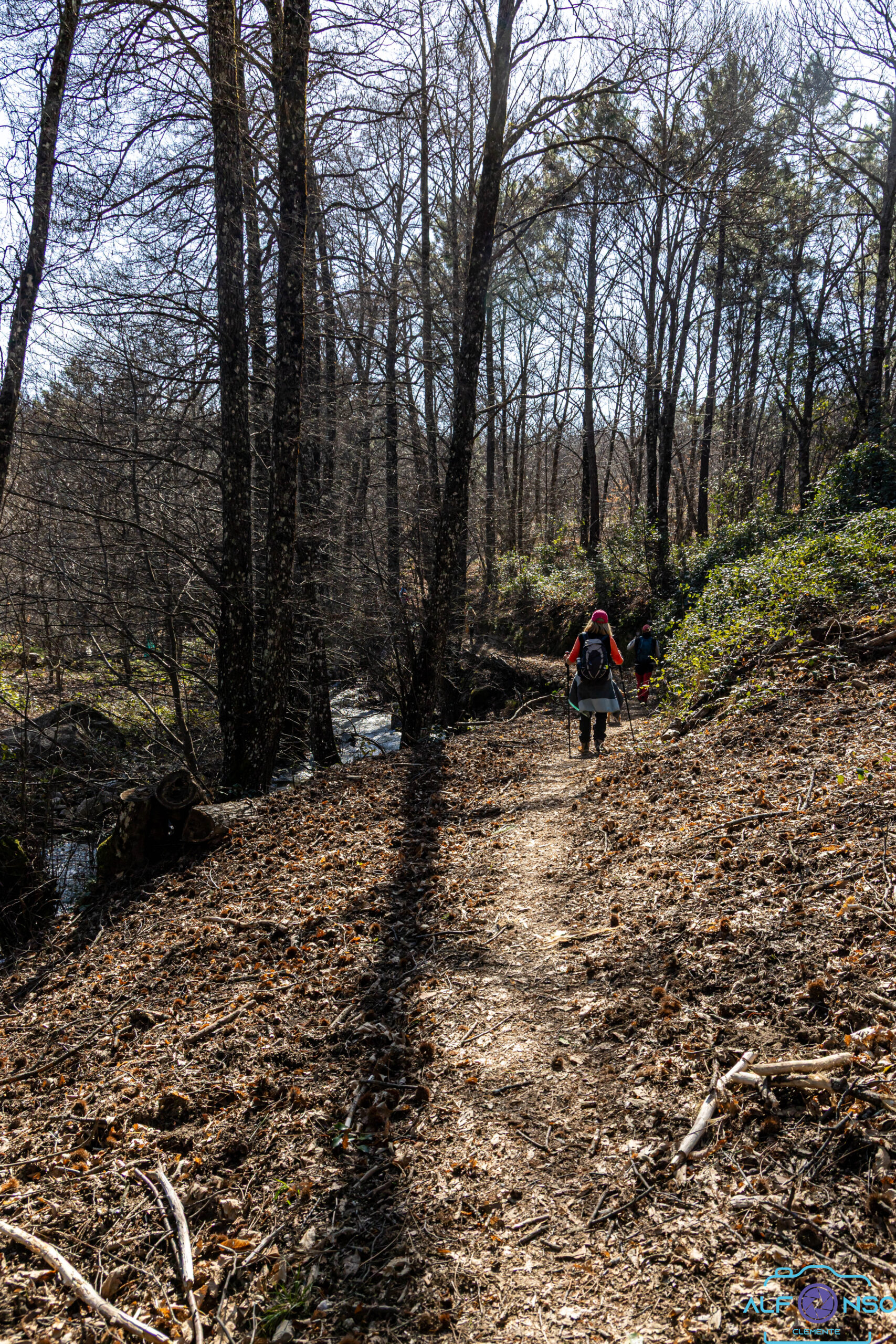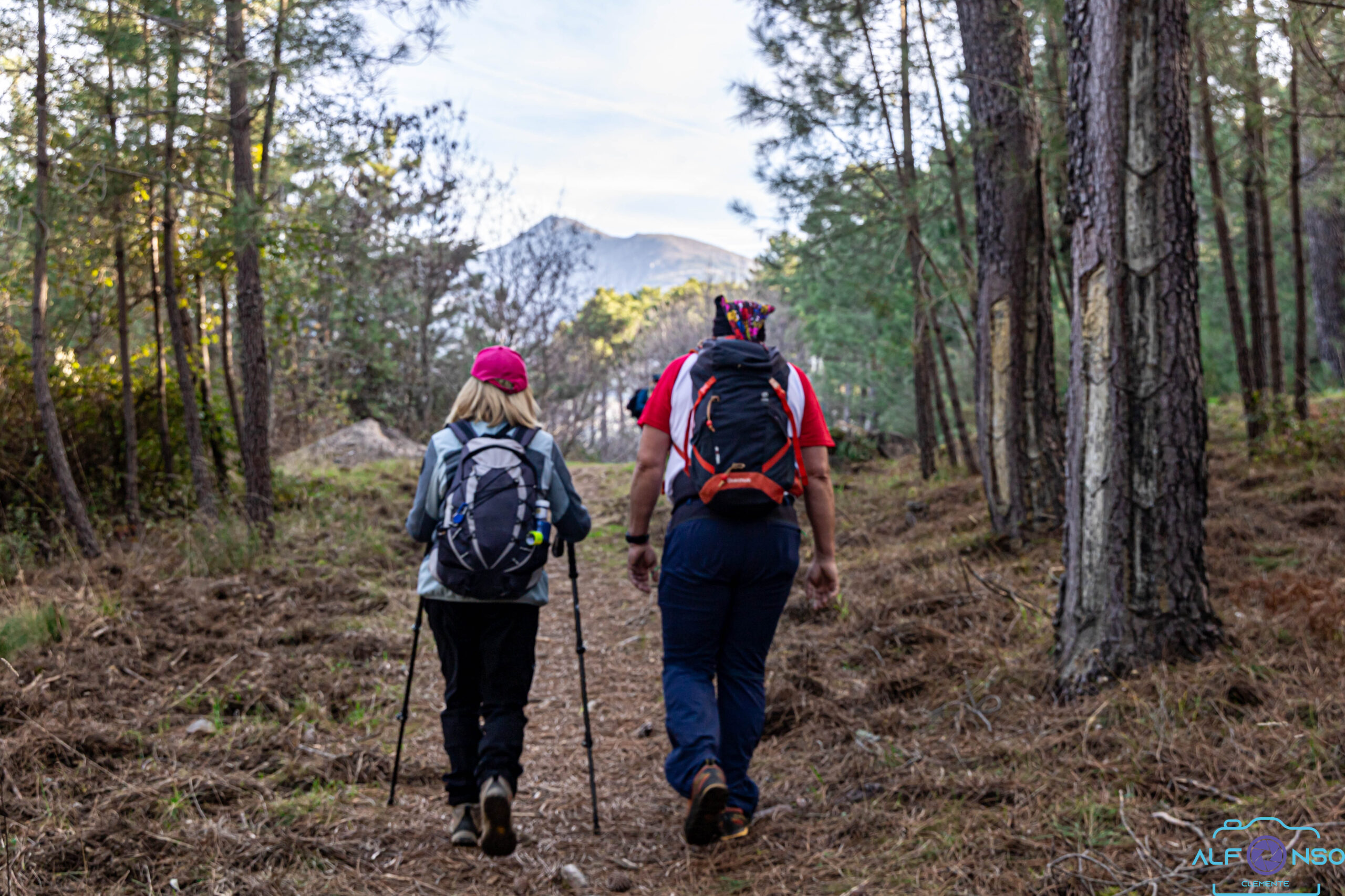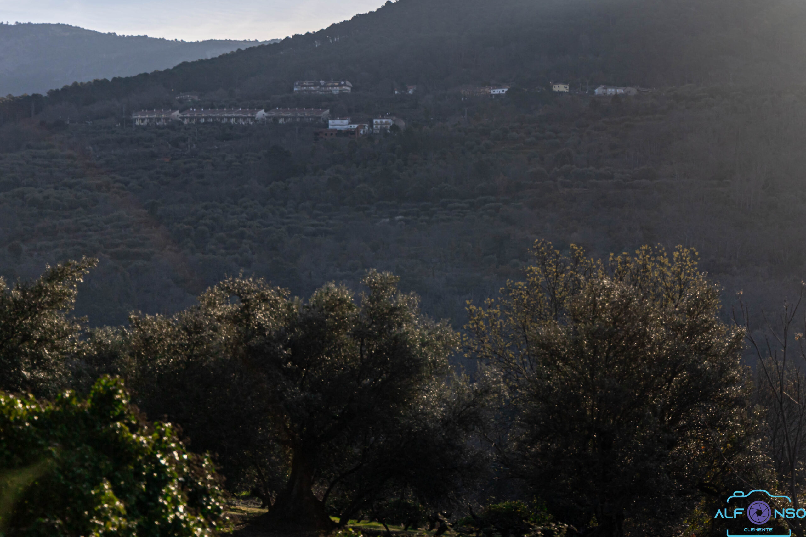 El sendero abandona la villa incorporándose durante un tramo a la Cañada Real, entre huertos, olivares y primeras masas de castaño.